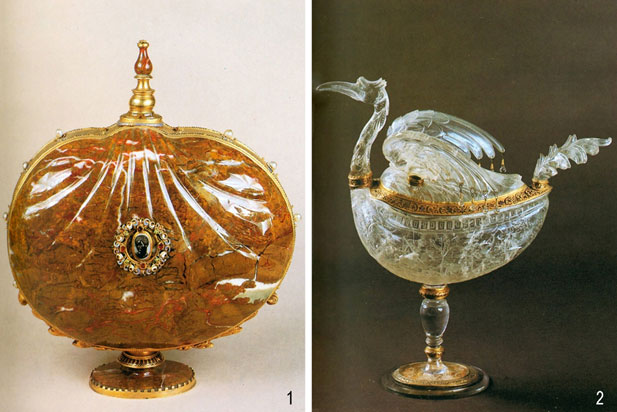 Ил. 49. 1. Флакон из яшмы. 1570 г. 2. Сосуд из горного хрусталя в форме птицы. 1570 г.