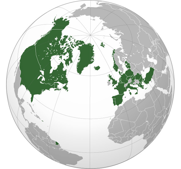 Организация Североатлантического договора (орфографическая проекция). Копия лицензии включена в раздел, озаглавленный GNU Free. Источник: https://goo.su/tKU9Ul