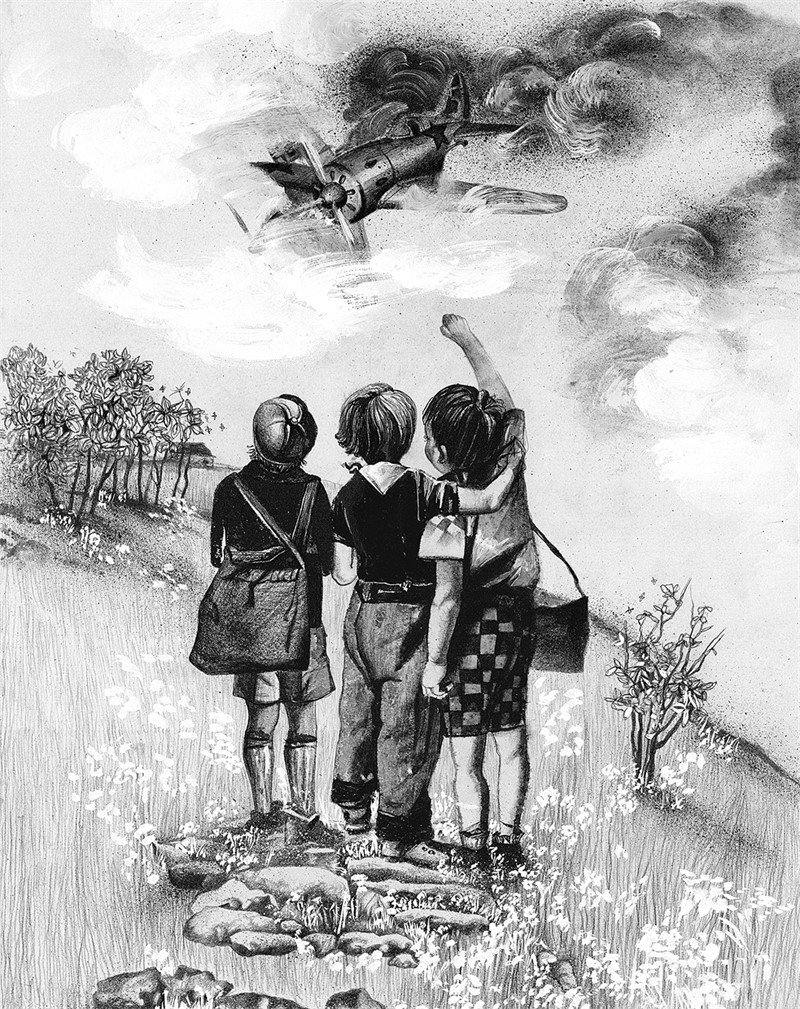 Лёва и Генка уже добежали до ближайшего дерева и плюхнулись в траву. А Юра всё ещё в оцепенении стоял на дороге и смотрел на приближающийся самолёт. Его чёрные кудряшки развевались на ветру. Теньканье пуль раздавалось совсем близко. Пробегавший рядом красноармеец толкнул мальчика в спину и, навалившись, придавил к земле.
