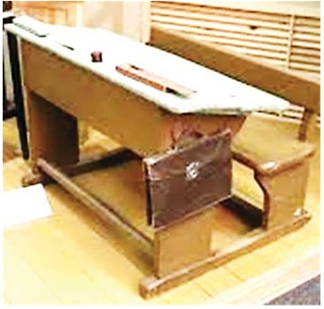 Вот типичная парта, за которой мы сидели на уроках. Сбоку на ней висит портфель, именно такой, какой мы носили.
