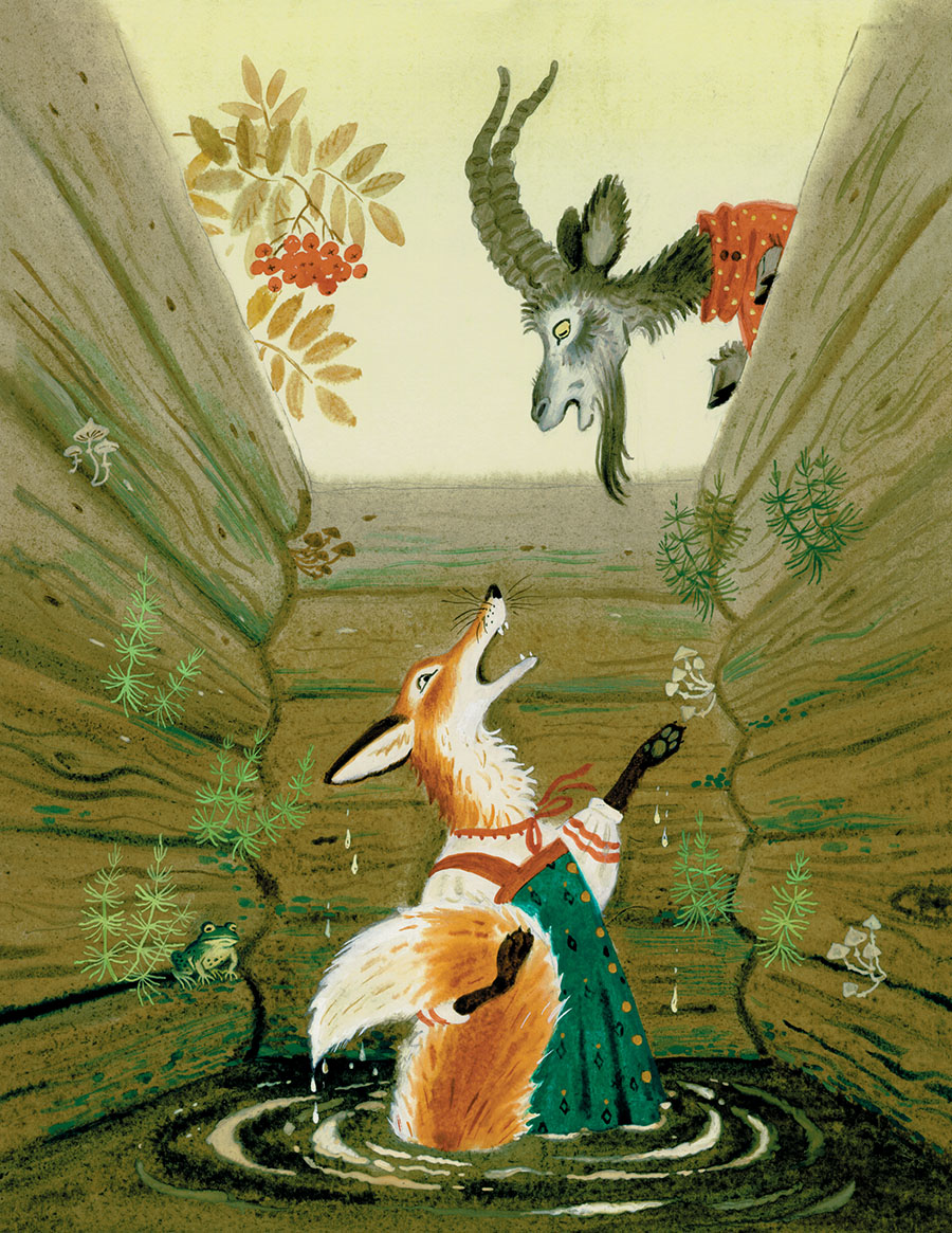 Бежала лиса, на ворон зазевалась и попала в колодец. Воды в колодце было немного: утонуть нельзя, да и выскочить тоже.