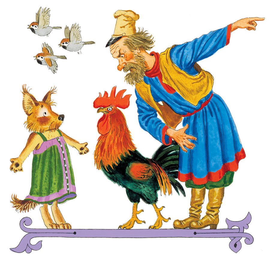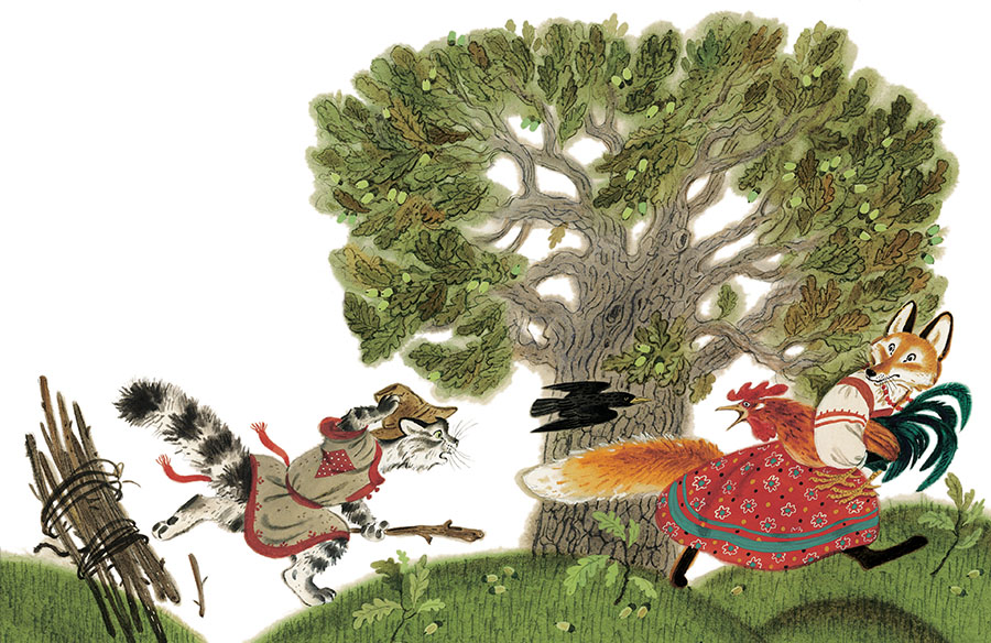 Кот и дрозд услыхали, бросились в погоню и отняли у лисы петушка.