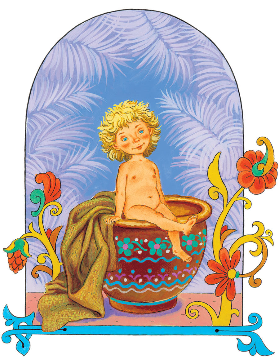 Однако старик принёс комочек снегу в избу, положил в горшочек, накрыл ветошкой и поставил на окошко. Взошло солнышко, пригрело горшочек, и снег стал таять. Вот и слышат старики пищит что-то в горшочке под ветошкой; они к окну глядь, а в горшочке лежит девочка, беленькая, как снежок, и кругленькая, как комок, и говорит им: