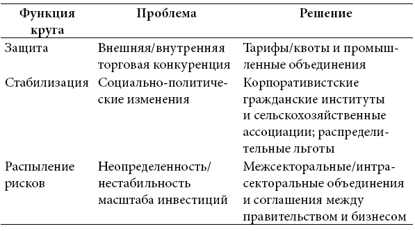 Выбранный Японией курс предполагал терпеливое воплощение трех институциональных императивов, с которыми столкнулись сами лидеры Мэйдзи: (1) защита торговли для зачаточной промышленности Японии; (2) политическая стабильность, чтобы способствовать национальному единству и уверенности в активном курсе страны; и (3) распыление рисков, призванное побудить банки и промышленников кредитовать и инвестировать огромные суммы, необходимые для строительства оптимальных по масштабу сталелитейных заводов, верфей и арсеналов. Каждая из этих задач указывает в качестве решения на ориентированные на сотрудничество коллективные действия круги компенсации, несмотря на явные долгосрочные препятствия для эффективности таких действий, что подчеркивали Олсон и другие [Olson 1982]. Эти три вызова эпохи Мэйдзи породили три функционально дифференцированных варианта парадигмы кругов компенсации, которые можно идентифицировать и сегодня. Они представлены в табл. 2.1.