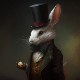 Всадник неожиданно бросился в сторону наглых ушей и в три огромных прыжка оказался прямо у старой березы с толстым стволом и пенечком рядом. У пенька стояло странное создание, похожее на большого белого кролика с большими белыми ушами. Однако, стояло оно не на четырех лапах, а на двух, а на теле был надет добротный черный фрак. Непропорционально большие зеленые глаза излучали вежливость и деловитость.