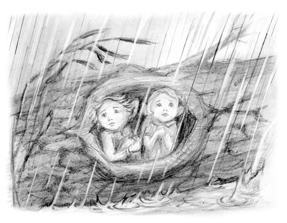 Бермяшь сгрёб в кучку сухие листья и ветки, найденные в дупле, а Дрыхала поднесла к ним искорки живого пламени и разожгла маленький костёр. Стало немного теплей. Дождь барабанил по дереву всё сильней, и казалось, что ему уже не будет конца. К тому же в округе появилось множество ручьёв, вода в заводях стала подниматься. Чтобы как-то отвлечься и согреться, Дрыхала стала рассказывать Бермяшу историю: