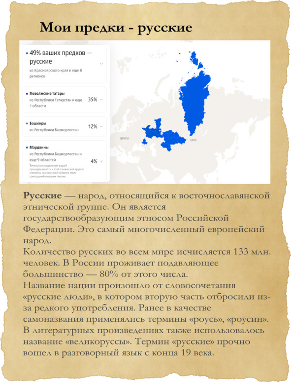 Благодаря генетическому тесту ДНК удалось точно определить к какой национальности относятся предки мои и мужа, и сделать это в процентном соотношении. Ожидаемо, что наибольший удельный вес занимают русские.