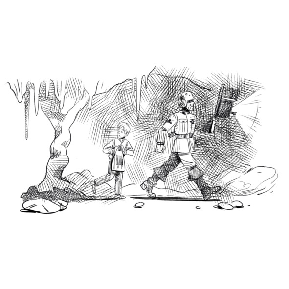 Разве может быть трусом сын космонавта? спросил он риторически и добавил: Ступай вперёд. Я посвечу. Открывшийся им тёмный проход оказался извилистым и узким. Свет партизанско-разведчицкого фонаря то и дело пропадал, оставаясь за поворотом, и Ване приходилось, вжимаясь спиною в сырые, холодные камни, боком, на ощупь протискиваться за угол в щель, в темноту. Один раз мальчишка даже обернулся, запереживав: «Как там пиратский партизан-разведчик?» Ведь он же был не только больше Ивана, но ещё и с громоздкою ношей. Но тот только махнул рукой, мол, всё в порядке, иди вперёд, смотри под ноги и не отвлекайся. Так они шли всё дальше и дальше, а проход постепенно становился всё шире и шире, потолок поднимался всё выше, и вот они уже шагали бок о бок, а луч мощного фонаря пиратского партизана-разведчика вяз во мраке, не дотягиваясь до отдалившихся стен подземелья. Глазам открывался какой-то ирреальный, какой-то инопланетный, какой-то космический пейзаж. Ванька даже почувствовал себя настоящим спелеонавтом. Свод пещеры вздымался над ними, словно чёрное ночное небо.
