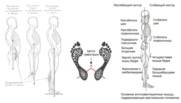 Коррекция вертикального положения при данной конфигурации осуществляется фоновой тонической работой постуральных мышц, главная из которых камбаловидная мышца голени.
