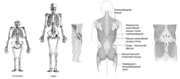 Редукция или выраженное снижение силы двух упомянутых мышечных групп в определенной мере является критичной для функции поясничного отдела позвоночника. Современный человек функционально утратил силу как раз именно тех мышц, которые вносят существенный вклад в стабилизацию поясничного отдела. Чисто анатомиически данные мышцы еще сохранились, но функционально они уже мало к чему пригодны без специальной тренировки (попробуйте подтянуться 50 раз на перекладине). Крестообразно пересекаясь, волокна этих мышц формируют надосную связку позвоночника и натягивают пояснично-грудную фасцию, которая является основным стабилизатором поясничного отдела позвоночника. Значительная потеря мышечной массы позвоночника при переходе от Бонобо к Австралопитеку, затем потеря двух стабилизирующих мышечных групп при переходе от Австралопитека к Человеку прямоходящему значительно ослабили всю конструкцию позвоночного столба и поясничного отдела в частности.