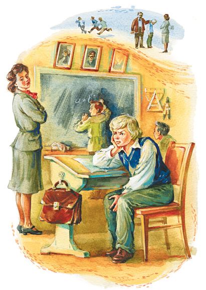 А у учительницы светлые волосы и добрая улыбка. Она посмотрела мне в глаза и говорит: