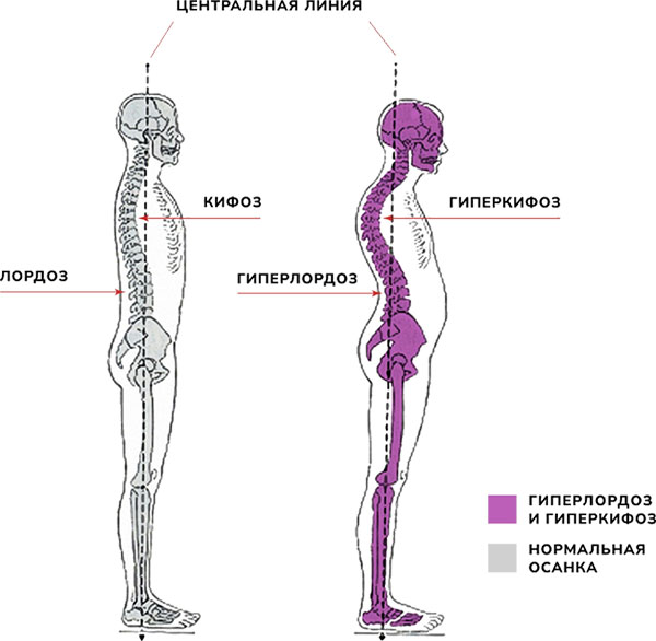 Чтобы компенсировать вдавленную, закрытую грудную клетку, ваш корпус создает отклонение в поясничном изгибе, которое проявляется либо как его избыточное увеличение гиперлордоз, либо как уменьшение «плоская поясница». В более тяжелых случаях даже может формироваться поясничный кифоз.