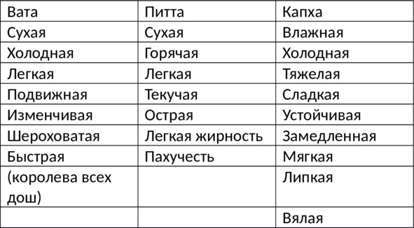 Доши определяют каким будет телосложение, пищеварение, нервная система, скорость реакции. Они решают будем ли мы иметь детей, посвятим ли себя науке или станем великим спортсменом. Они причина наших болезней или, наоборот, отменного здоровья.