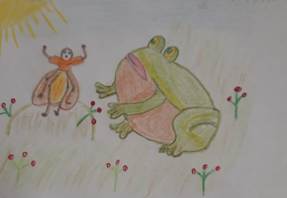 А Жу-Жу как увидела такой длинный язык, так и присела от страха. Лапки подкосились. Крылышки опустились. От ужаса вся онемела и взлететь не может. Ох, быть беде!