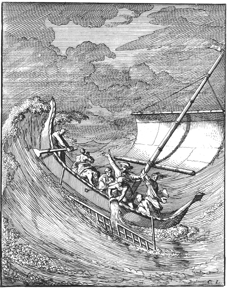 Дампир и его команда едва не погибли во время яростного шторма по пути в Индонезию (гравюра Каспара Луйкена).