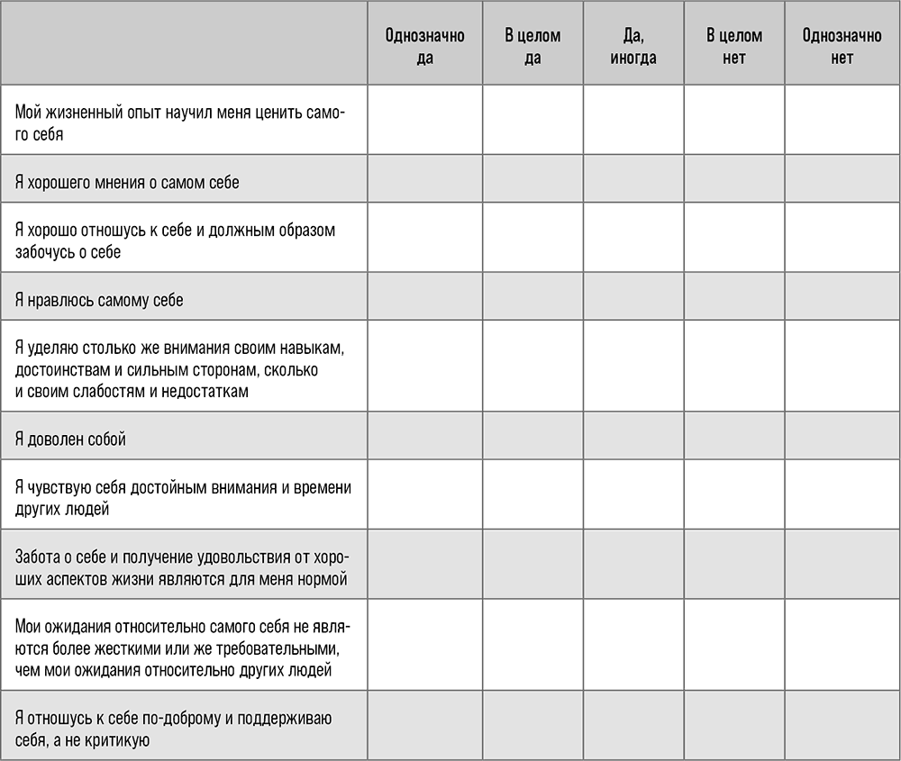 Взгляните на десять вопросов, которые представлены ниже. Поставьте крестик напротив каждого из них в той колонке, которая лучше всего описывает ваше отношение к самому себе. Будьте честны здесь нет правильных или неправильных ответов, важна лишь честность относительно того, как вы себя видите.