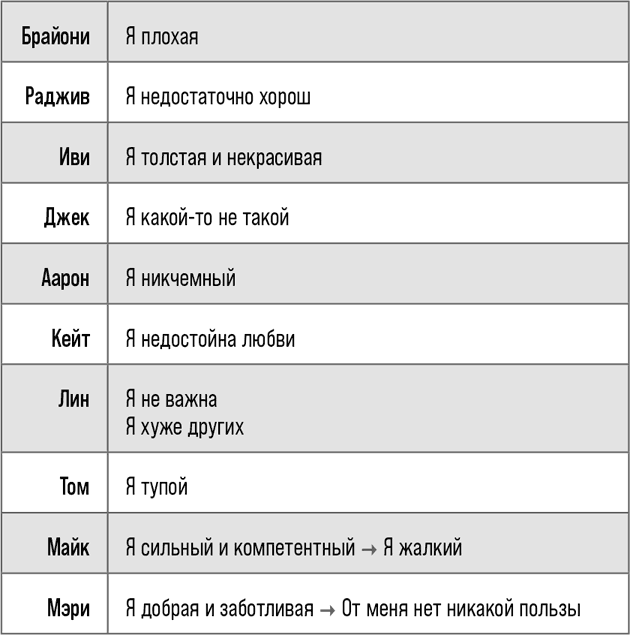 Удручающие представления о самих себе, которые развились у этих людей, естественным образом связаны с тем, какой у них был жизненный опыт. Их мнение о самих себе абсолютно закономерно, если мы учитываем все то, что им довелось пережить. Однако, читая их истории, соглашались ли вы с их мнением? Думали ли вы, что Брайони плохая, Раджив недостаточно хорош, Иви толстая и некрасивая, а Джек какой-то не такой? На ваш взгляд, был ли никчемным Аарон, заслуживал ли он того, чтобы стать изгоем? Согласны ли вы с тем, что Кейт не заслуживает любви, что Лин не важна и хуже других, что Том тупой, Майк жалкий, а от Мэри нет никакого толка?