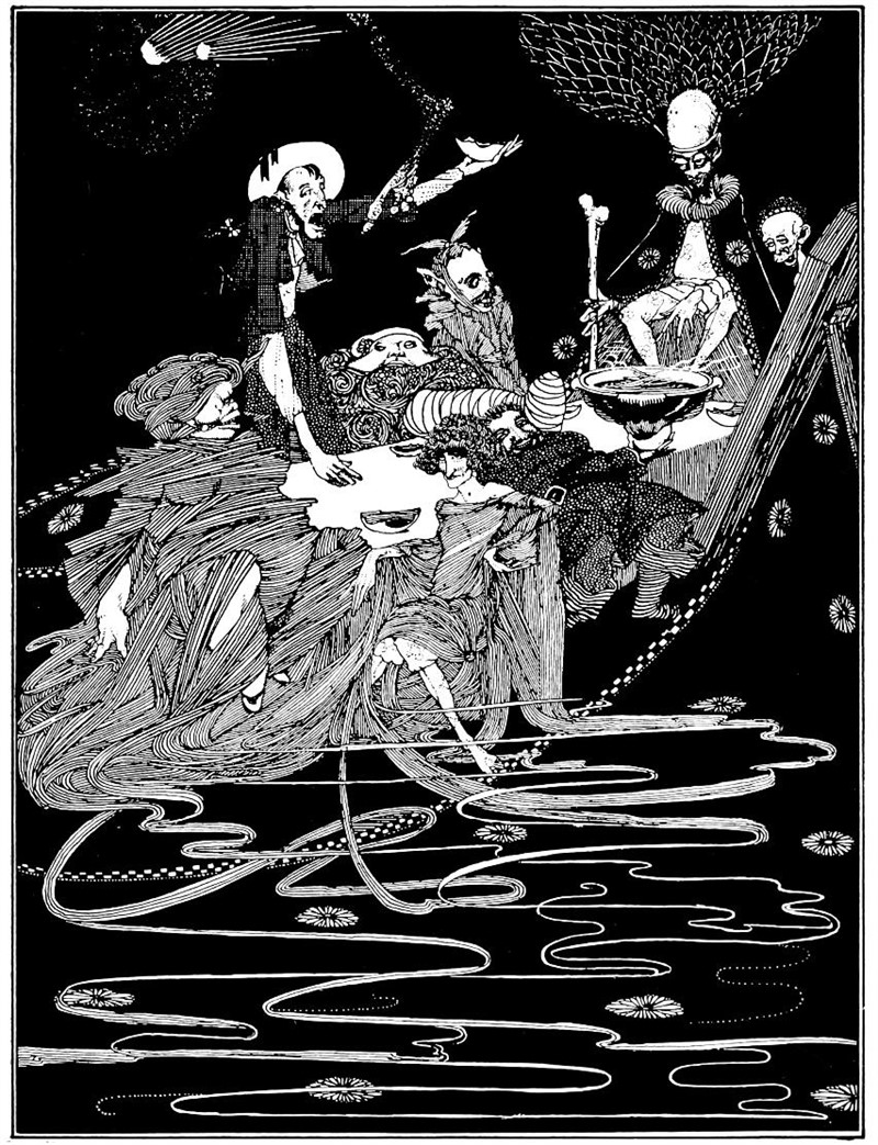 Но длинный председатель, не возмущаясь таким крайне грубым поведением, очень милостиво улыбнулся незваным гостям величаво кивнул им черными перьями и, встав, взял каждого из них за руку и отвел к сиденьям, тем временем поставленным для пришедших кем-то из компании. Рангоут не оказал ни малейшего сопротивления, но уселся, как ему указывали; а кавалерственный Хью перенес свои козлы с места в головах стола поближе к маленькой чахоточной барышне в саване, превесело плюхнулся рядом с нею и, налив череп красного вина, залпом осушил его за продолжение знакомства. Окостеневший господин в гробу, казалось, был крайне возмущен таким дерзким поведением; и могли бы возникнуть серьезные последствия, но председатель, постучав по столу, привлек внимание всех присутствующих следующей речью: