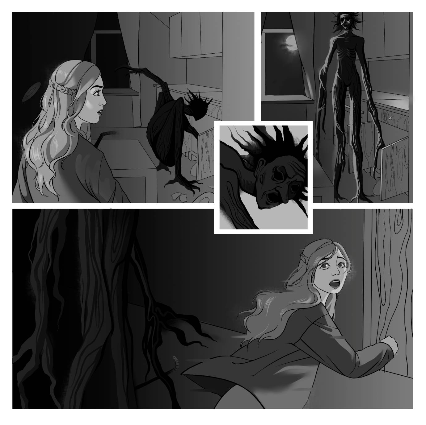 С кухни донесся звон бьющейся посуды. Детектив схватила раскаленную кочергу за деревянную ручку и приоткрыла дверь, выставив прут перед собой. Заря вглядывалась во тьму и вскоре заметила едва различимый тонкий силуэт в противоположном конце кухни, нагнувшийся у шкафчика с посудой. Незваный гость доставал всю кухонную утварь, что попадалась ему на глаза, и швырял себе за спину. Девушка тихо шагнула в комнату, пригибаясь от хаотично летящих ложек и ножей, как вдруг под ногой раздался хруст, на полу она увидела разбитое блюдце, рисунок розы на нем раскололся надвое. Стоявший до сих пор грохот стих. Тень у шкафов выпрямилась в полный рост, почти упираясь в потолок, и повернула то, что должно было быть ее головой, в сторону Зари. Луна осветила комнату, и теперь девушка могла рассмотреть нечисть.