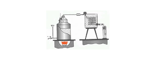 Перегонка освобождает этанол как от легколетучих, так и от тяжелых фракций органических веществ (кубовый остаток). В кустарном (домашнем) приготовлении «алкогольных напитков» в качестве очистки используют тот же метод перегонки или, как его еще называют, дистилляции, но значительно упрощенный. Емкость с брагой соединяют шлангом со змеевиком, опущенным в холодную воду, на выход змеевика надевается трубка, конец которой опускается в емкость для сбора этилового спирта. При нагреве емкости с брагой происходит кипение браги и выделение легких фракций, пары которых, охлаждаясь, оседают на змеевике и стекают в приемник. Это наиболее ядовитые составляющие браги, они не годятся даже для наружного применения и удаляются. При последующем нагревании происходит отделение паров этилового спирта, которые, так же оседая в змеевике, конденсируются и стекают в емкость для приема спирта. Здесь важно не перегреть брагу, иначе вместе с этиловым спиртом начинают испаряться и более тяжелые (а также более ядовитые) вещества. Собранную спиртовую смесь в дальнейшем подвергают вторичной перегонке для очистки от попавших в нее тяжелых веществ. На выходе получают «алкогольный продукт», который в разных странах называется по-разному: самогон, виски, коньяк и т. д. Кустарный (домашний) способ очистки довольно упрощенный позволяет относительно легко очистить и концентрировать этиловый спирт, но качество очистки довольно низкое, и конечный продукт все же содержит большое количество посторонних веществ (они, к сожалению, являются сильными ядами).