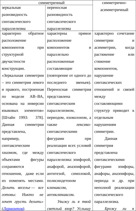 Фигуры синтаксического параллелизма c позиции симметрии-асимметрии представляют собою два вида: симметричный, симметрично-асимметричный,