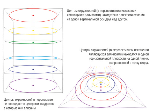 Илл.34. Особенности построения окружностей с общим центром в перспективе