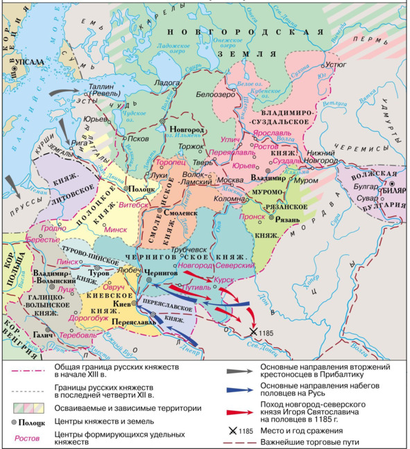 1185 новгород-северский князь Игорь Святославич совершил поход против половцев. Игорь собрал небольшое войско и отправился в степь, но его войско было разгромлено и сам он оказался в плену. По мотивам этого события была написана поэма «Слово о полку Игореве». Автор укоряет князей за вражду и призывает к объединению ради победы над врагами.