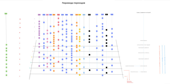 Затем необходимо пройтись по всем линиям и элементам, понять, что означает каждый из них. Далее, можно взять несколько компаний для примера и расположить их на этой пирамиде. Справа следует написать название компании и определить ее место на пирамиде, где верхняя точка отображает компанию будущего, а нижняя точка компанию прошлого. Затем необходимо провести линии, пересекая в нужных квадратах линии смыслов, что позволит получить ломаную кривую.