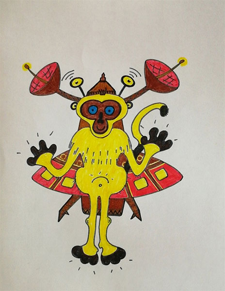 Наш герой выглядел как зверёк с желтой шкуркой, похожий на обезьянку, но с антеннами на голове. Он ходил, как люди, на двух ногах, умел разговаривать и читать на всех человеческих языках. А ещё Космик мог понимать язык всех живых существ (у него с собой был специальный приборчик, который всё переводил на его родной язык).