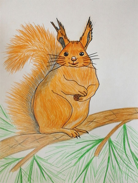 Белочка Пушинка жила в красивом домике, на высокой сосне. Она была рыженькой, с беленьким пятнышком на мордочке и пышным хвостиком.