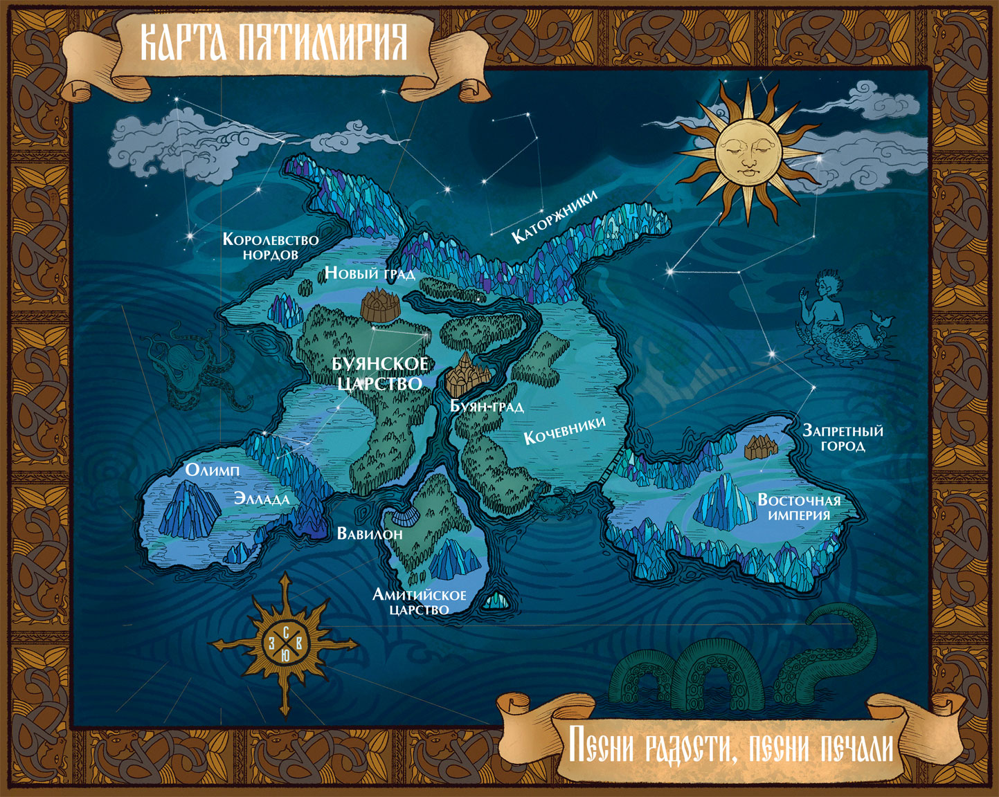 Дорогой читатель! Я искренне рад, что в ваши руки попала моя книга. На последующих страницах развернется история, которая не давала покоя моему воображению. В отличие от истории настоящей, из учебника, здесь не будет Руси, Древней Греции, Индии и других знакомых нам государств. Вдохновением для меня послужили герои наших родных сказок, мифов и легенд от тех, что идут из глубины веков, до творений Александра Сергеевича Пушкина. Перечитывая их, досконально изучая их корни, я убедился в том, насколько сильно на русскую культуру на протяжении эпох влияли другие народы. Несмотря на уникальность и самобытность русских сказов, отрицать воздействие на них со стороны византийцев, скандинавов, персов и прочих соседей бессмысленно. Так и родилось Пятимирие: для каждого из государств, его составляющего, нашелся прародитель. Да, с исторической точки зрения аккадцы вряд ли пили чай с русичами, но вот связей культурных между ближневосточными и славянскими народами не счесть. В Пятимирии все немного иначе, чем в жизни: и география, и технические достижения, и даже ход времени. Я сознательно не привязывался к конкретному веку в нашей истории, поэтому пусть вас не смущает то, что у буянцев есть корабли с каютами, книгопечатание и масляные лампы. Что-то позаимствовали у соседей, что-то изобрели сами. Для меня это смешение эпох со щепоткой магии. Одним словом фэнтези. А вот чувства и поступки героев, надеюсь, получились настоящими и очень честными.