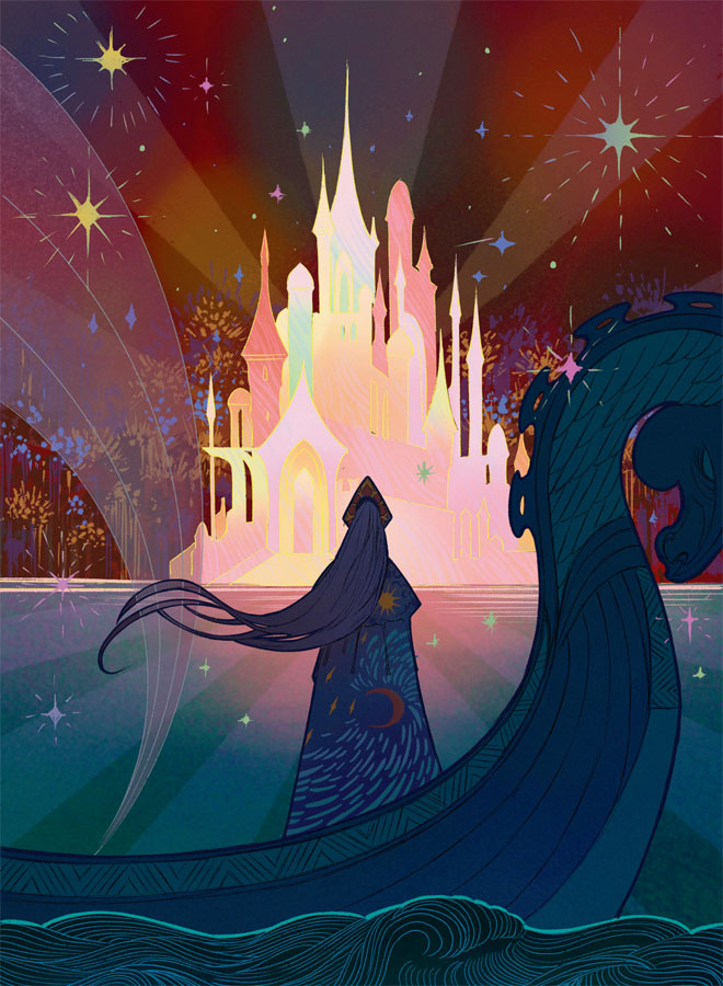 В этот момент девушка проследила за взглядом своего собеседника, и звук ее голоса оборвался. Довольному прищуру Казимира Твердиславича предстала великолепная картина: в широко открытых, цвета горечавки глазах Милы отражался величественный силуэт красивейшего из городов Пятимирия Буян-града.