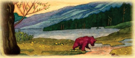 Когда Медвежонка вышла на берег, с её шкурки ручьями стекала вода.