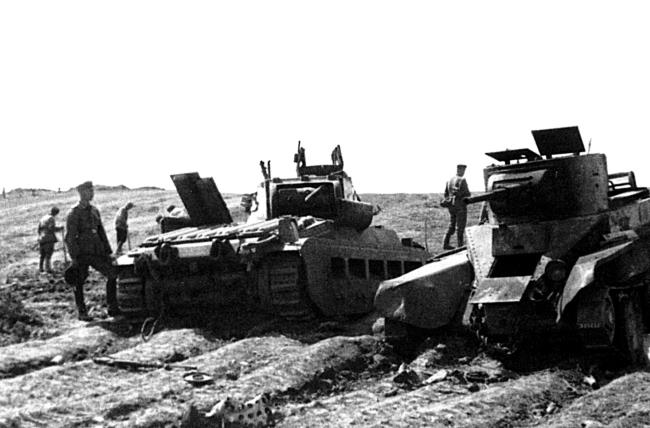 Поле битвы под Харьковом изобиловало подбитыми танками. Свежие жертвы, такие как британский танк «Матильда» слева, соседствовали с ржавыми корпусами, оставшимися от битв 1941 года, как этот БТ-7 справа