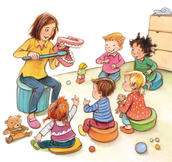 Проверяйте, чтобы мама или папа не забыли ни про один ваш зуб, когда будут их чистить, говорит она, показывая, как правильно держать щётку.