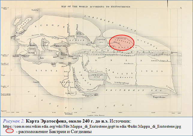 Бактрия и Согдиана на карте Эратосфена расположены в верхней части Азии. Однако при этом север Азии информационно не слишком отличается от севера Азии на более древних картах (Рисунок 1). Эратосфен не исправил серьезные ошибки, касающиеся этих территорий: Каспийское море через некое «горло» по-прежнему сообщается с океаном; в Каспийское море с востока впадают две огромных реки Яксарт и Окс, хотя в действительности здесь нет никаких больших водных артерий; не указан самый крупный в Азии Обь-Иртышский бассейн с такими большими реками, как Обь, Иртыш, Тобол; неточное расположение горных массивов. Меотида (Аральское море), куда впадает Танаис (Яксарт-Сырдарья) и которая столь часто упоминается сподвижниками Александра, вообще не отмечена на карте.