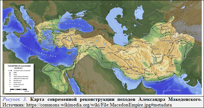 Возникает вопрос чем занимался в походе так тщательно подбираемый «ученый отряд»? Почему на карте не видно результатов их работы? Согласно современным представлениям Бактрия и Согдиана находились на территории сегодняшних Узбекистана и Таджикистана в восточном междуречье Амударьи и Сырдарьи (Рисунок 3), которые на карте Эратосфена называются Окс и Яксарт. Почему же за столь длительное время нахождения здесь ученые не обследовали этот район и не внесли хоть какие-то изменения в более ранние представления? Ведь не для прогулки их брал с собой Александр.