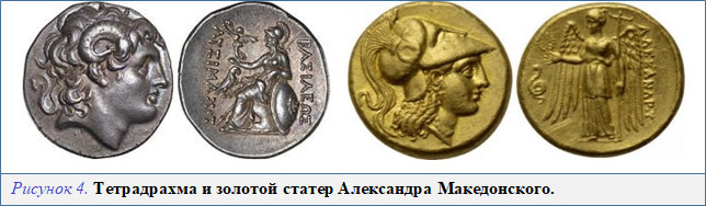 Помимо медной разменной монеты в ходу были различные варианты серебряных тетрадрахм (вес 17,13 г, диаметр 25 мм) и золотых статеров (вес 8,67 г, диаметр 16 мм) с изображением профиля Александра Македонского (Рисунок 4.). На серебряной тетрадрахме голова Александра покрыта скальпом Немейского льва или диадемой с рогами бога Аммона-Ра, на золотом статере Александр изображается в коринфском шлеме. На обратной стороне изображения варьируются различные боги, богини, герои (Геракл, Зевс, Афина, крылатая Ника) и их атрибутов (орел, палица, жезл, щит, головы животных, змея, лавровый венок и т. д.). В этих двух монетах Александр явно захотел отразить свою метаморфозу от рогатого варвара, каковым его считали греки, до царя Азии, олицетворяющего весь цивилизованный мир.