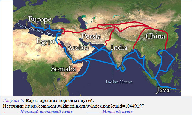 Денежные знаки Александра Македонского оказали влияние на чеканку и хождение монет на трех континентах от Индии до западной Европы, от Причерноморья до Египта. Если в начале его правления деньги использовались преимущественно лишь для оплаты содержания военных и взимания дани и налогов, то к началу нашей эры небывалый размах приобрела оптовая торговля. Торговые пути растянулись от Атлантического океана до Тихого, от Европы до Китая (Рисунок 5). По Великому шелковому пути в Средиземноморье потянулись караваны с китайским шелком. По морскому пути, открытому Александром, из Индии в Европу пошли приправы, специи, золото, драгоценные камни, хлопковые ткани, из тропической Африки слоновая кость и эбеновое дерево, из Аравии благовония. Средиземноморские товары пошли в обратном направлении. Сильный импульс получает работорговля. Попутно развивается банковская система, совершенствуется система налогообложения.
