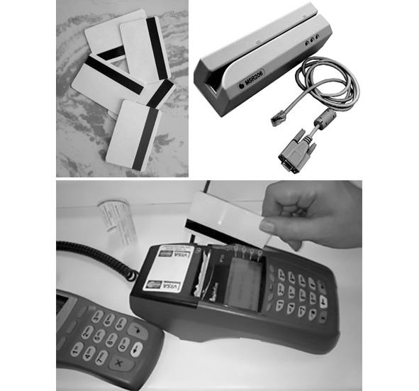 Снимок вверху слева: тот самый «белый пластик». Обратите внимание на разницу цветов магнитного покрытия разных карт они напечатаны различными производителями, точнее, различными станками. Из каждой такой болванки c помощью простенького прибора, называемого энкодер (снимок вверху справа), можно сделать двойника банковской карты с суммой на счёте, скажем, 70 тыс.$ или 100 тыс.$, в зависимости от того, какие реквизиты имеются в вашем распоряжении. На первый взгляд, никаких особых проблем такая операция не доставляет это действительно проще, чем кажется. Другое дело, что проблемы всё же возникают, но позже. Снимок внизу: при наличии знакомого продавца «белый пластик» можно использовать не только в банкоматах, но и для небольших транзакций в магазинах, гостиницах, барах. Если оплаты производить нерегулярно и небольшими суммами, но владельцы карт их зачастую вообще не замечают. Удобство данного способа заключается в том, что оператор POS-терминала, находящийся в сговоре с мошенником, не «сдаст» его правоохранительным органам, а напротив, сообщит им неверную информацию и своевременно проинформирует преступника о том, что карта-дубликат попала в стоп-лист и от неё нужно избавиться.