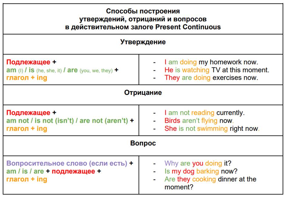 Present Continuous это простое время, выражающее происходящее в текущий момент. Используется в речи тогда, когда мы говорим о событии или действии в данный момент. Active voice (действительный залог) показывает на того, кто совершает действие.