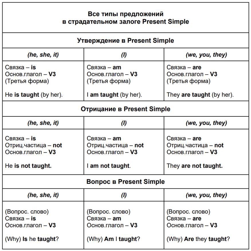 Помните, что Present Simple не ограничивается глаголами связки is, am, are; окончаниями глаголов s/es и вспомогательными глаголами do/does. В страдательном залоге в Present Simple правила обязуют нас использовать третью форму глагола, как и в любом другом времени.