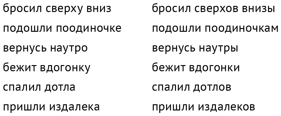 × слитные слова типа «назло, напрямую» (ошибки в сторону пробелов «на зло, на прямую»);