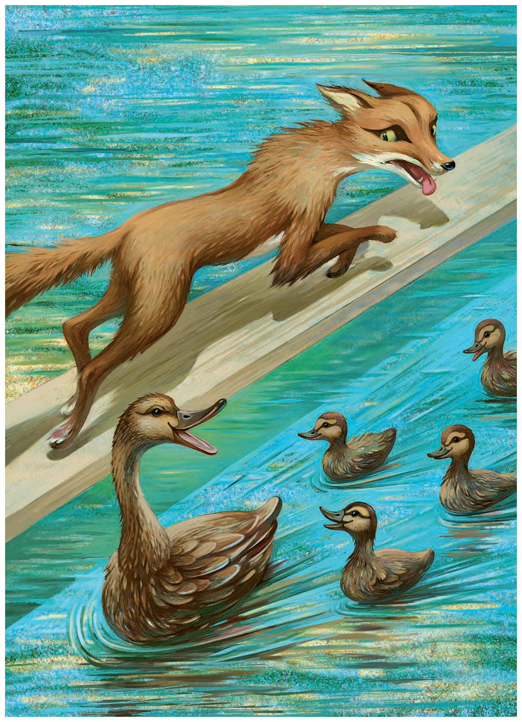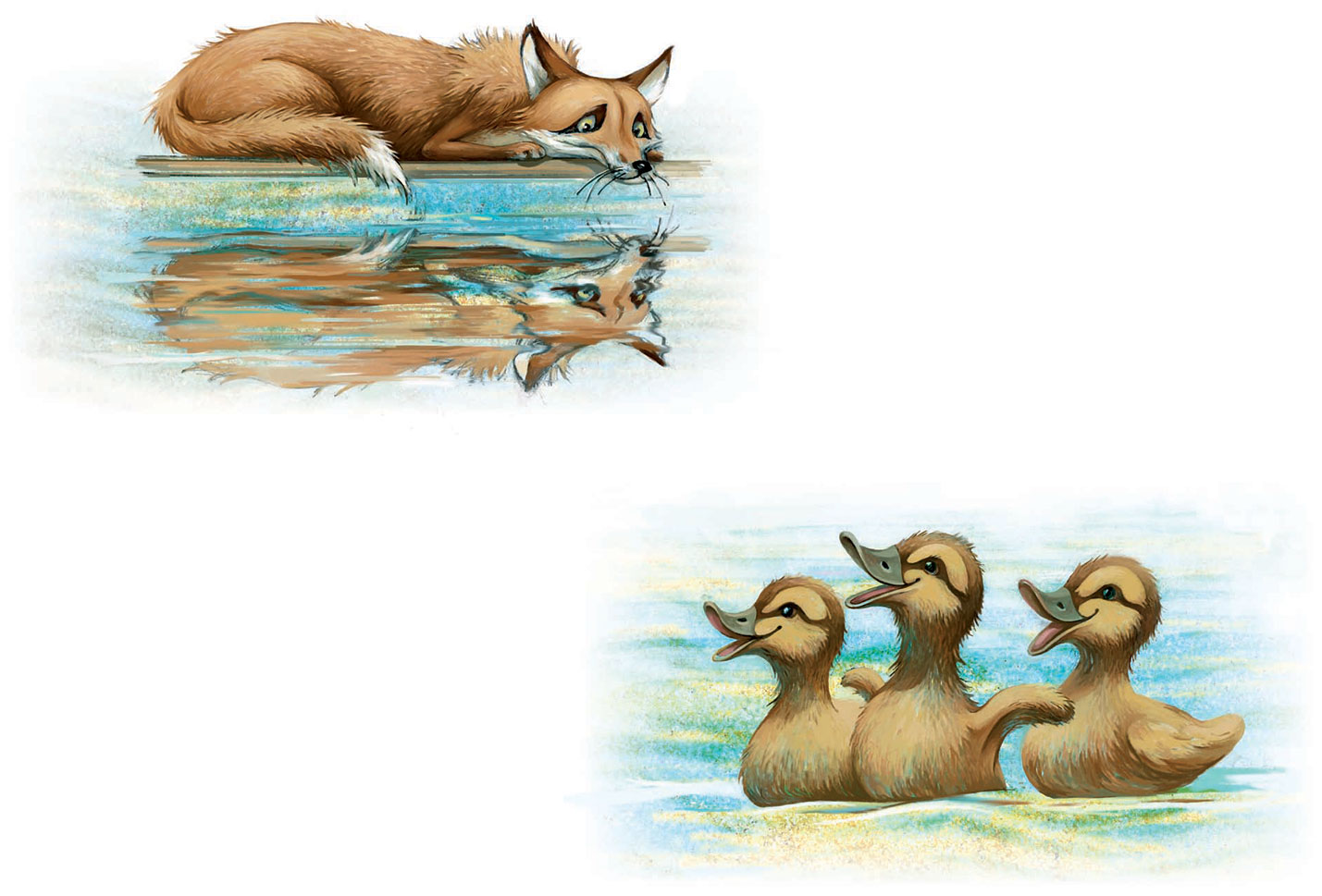 Поперёк ручья лежала доска. Лиса бросилась по ней на другой берег, но старая утка её увидала, нырнула со всей своей семьёй в воду и выплыла у противоположного берега. Лиса кинулась туда, а утки опять назад. Надоело Лисе без толку бегать по доске взад-вперёд; и утки сбились в кучу посреди ручья, никак их там не достанешь. Да ещё и дразнятся: «Кряк, кряк!»