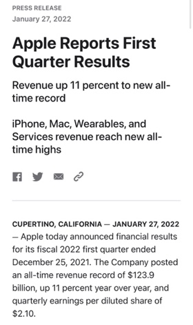Рисунок 2. Скриншот фрагмента пресс-релиза Apple от 27 января 2022 г. о результатах за 1-й квартал 2022 финансового года. Источник: apple.com.