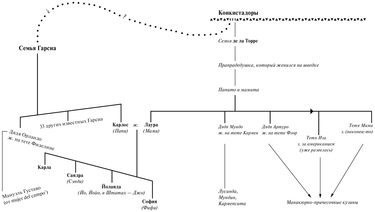 Йоланда, ее кузины и тетушки сидят в ожидании спичек. Сквозь лозы бугенвиллеи, карабкающиеся по стенам патио, ползущие по решетчатой крыше и роняющие малиновые и пурпурные цветки, просачивается позднее солнце. Патио тети Кармен место сборищ всего участка. Она вдова главы клана, поэтому ее дом самый большой. По ухоженным садам за ее патио расходятся в разные стороны узкие каменные тропинки. После торта и cafecitos[5] кузины разойдутся этими тропками по своим домам на огороженных участках. Позже они будут приглядывать за тем, как кухарки стряпают ужин для их мужей, которые разом устремятся домой по окончании «счастливого часа». Один из кузенов как-то похвастался, что этот вечерний час должен называться «часом шлюх». И не преминул растолковать Йоланде, что в это время доминиканские мужчины определенного класса заглядывают к любовницам по дороге домой.
