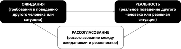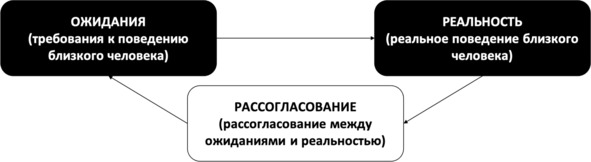 Обида и гнев очень схожи, поскольку являются следствиями требований к окружающим, и отличаются только тем, что обида чаще возникает в отношении близких людей, хотя гнев также нередко образуется в силу требований к родным, друзьям или знакомым. В обиде, как и в гневе, можно выделить три главных компонента: ожидания и требования человека относительно поведения близкого человека, реальное поведение близкого человека и рассогласование между ожиданиями и действительностью: «Муж должен был подарить мне цветы», «Мой сын не должен был меня обманывать» и т. д. (рис. 19).