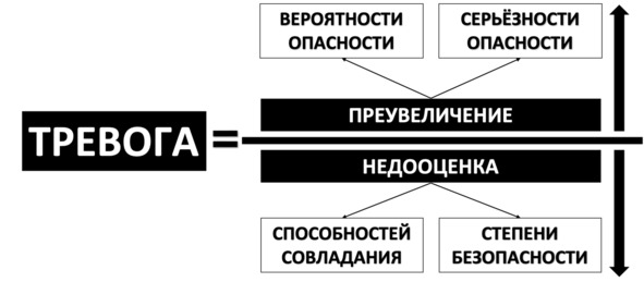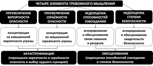 Итак, в самом тревожном мышлении можно выделить четыре главных элемента, которые и обуславливают возникновение тревоги преувеличение вероятности опасности, преувеличение серьёзности опасности, недооценка способностей совладания и недооценка степени безопасности. В схематичном формате элементы тревожного мышления наглядно представлены ниже (рис. 15).