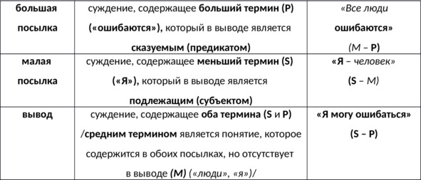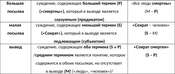 При осуществлении логического диспута нередко используется категорический силлогизм Аристотеля. Силлогизм способ логического дедуктивного умозаключения, в рамках которого из двух исходных истинных суждений (посылок) с необходимостью выводится третье истинное суждение (вывод). Итак, категорический силлогизм включает в себя большую посылку («Все люди смертны») и малую посылку («Сократ человек»), из которых с неизбежностью следует вывод: «Сократ смертен». Таким образом, структура категорического силлогизма такова (таб. 25):