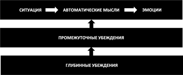 Так, чтобы не чувствовать себя слабым (глубинное убеждение), человек вырабатывает определённое правило жизни: «Я должен быть сильным». Чтобы не чувствовать себя беспомощным (глубинное убеждение), человек формирует правило «Я должен всё контролировать». Ещё один пример: чтобы не ощущать себя в опасности (глубинное убеждение «Мир опасное место»), человек создаёт правило «Я должен всё контролировать и всем управлять». Таких правил (промежуточного уровня) может быть очень много: «Я должен быть умным», «Я должен быть лучшим», «Я должен добиваться успеха», «Я должен быть хорошим любовником», «Я должна быть хорошей мамой». Все эти правила суть защиты, которые человек выстраивает внутри, чтобы не чувствовать себя глупым, беспомощным, плохим или не казаться таковым окружающим. Итак, глубинные, а также прикрывающие и обслуживающие их промежуточные убеждения образуют фундамент, который не осознаётся человеком и перманентно управляет его реакциями. В этом отношении глубинные и промежуточные убеждения работают словно фабрики по производству автоматических мыслей, а в автоматических мыслях часто отображается содержание промежуточных и глубинных убеждений (рис. 14).